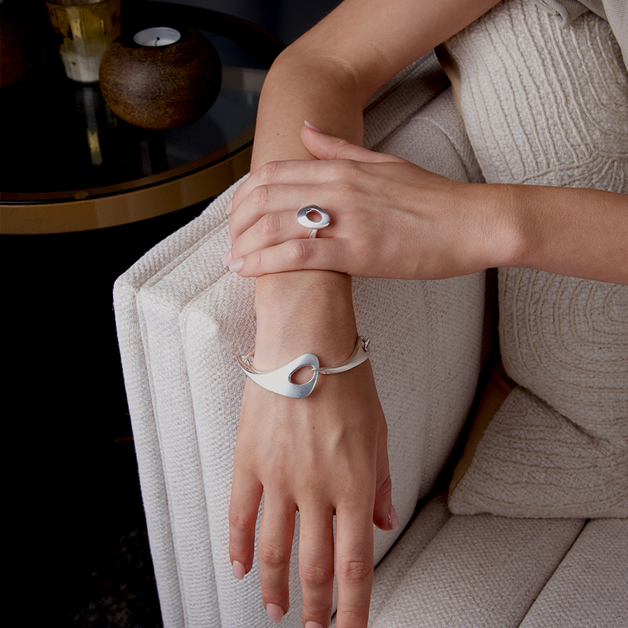 Inspired by pure white bones sitting on top of the quintessential red soil of the Australian outback. With soft sweeping curves, this contemporary collection uses polished and brushed silver to capture the natural elegance of the form.
